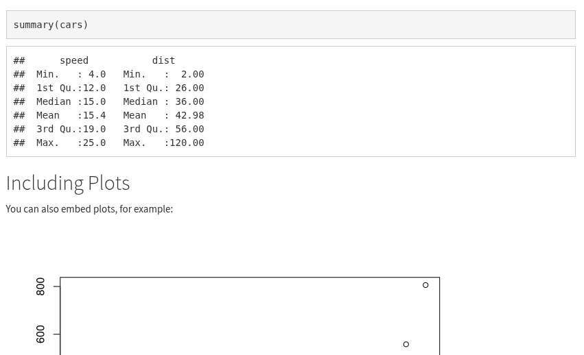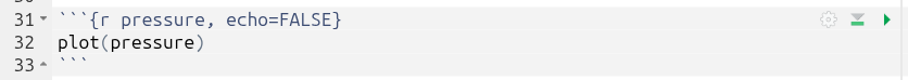 This overrides the global default that was set - echo=TRUE - which tells R when knitting to include the code chunk in the knitted output. So, by setting echo=FALSE for this code chunk, it will not display in our knitted file. If you look at your knitted file, you will see that whilst the summary(cars) code is included, plot(pressure) is not.