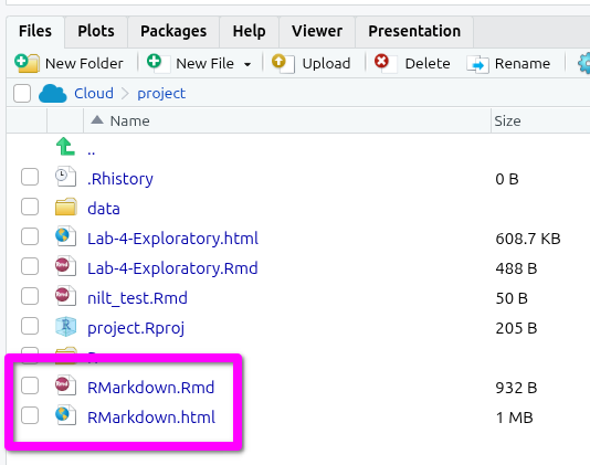 When you knitted the document, RStudio actually created a new .html file with the same name as your R Markdown document. You can confirm this by looking in the ‘Files’ tab in bottom-right.