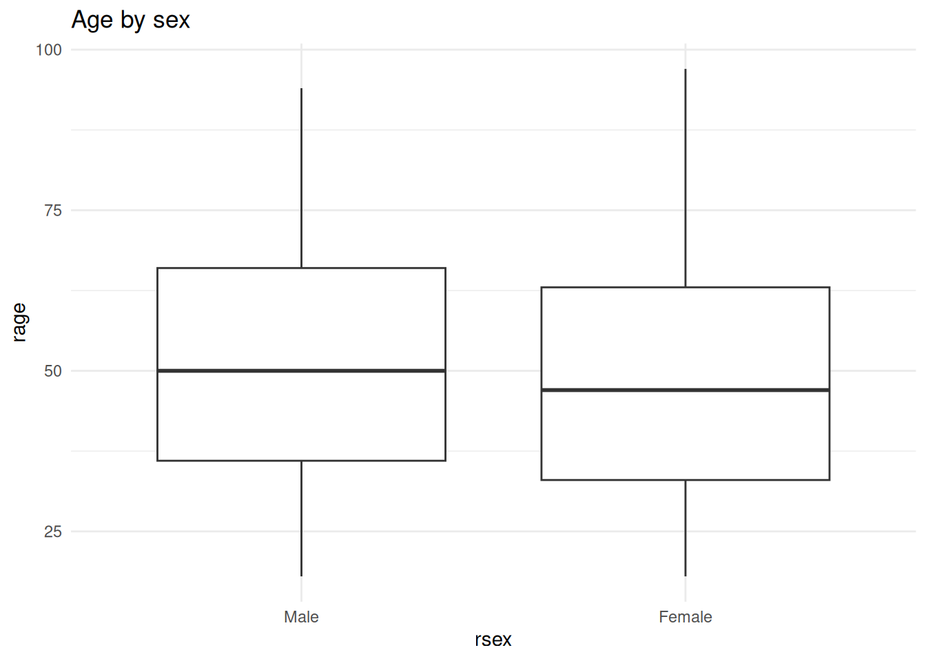 Very often we want to summarise central or spread measure by categories or groups. For example, let’s go back to the example of age and respondents’ sex. We can visualize these two variables (which include one numeric and one categorical) using a box plot. To create this, we need to specify the x and y value in aes() and include the geom_boxplot() geometry.
